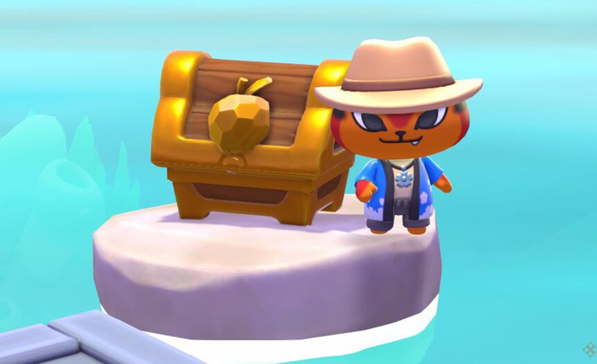 Чтобы добраться до первого сундука, вам понадобятся Ласты. Быстро переместитесь к почтовому ящику “Лунного острова” (Moon Island) в Курортной зоне. Прыгайте в океан справа и плывите на восток. После небольшого заплыва вы увидите плавающие ящики, а рядом с ними, на камне, будет лежать Золотой сундук.