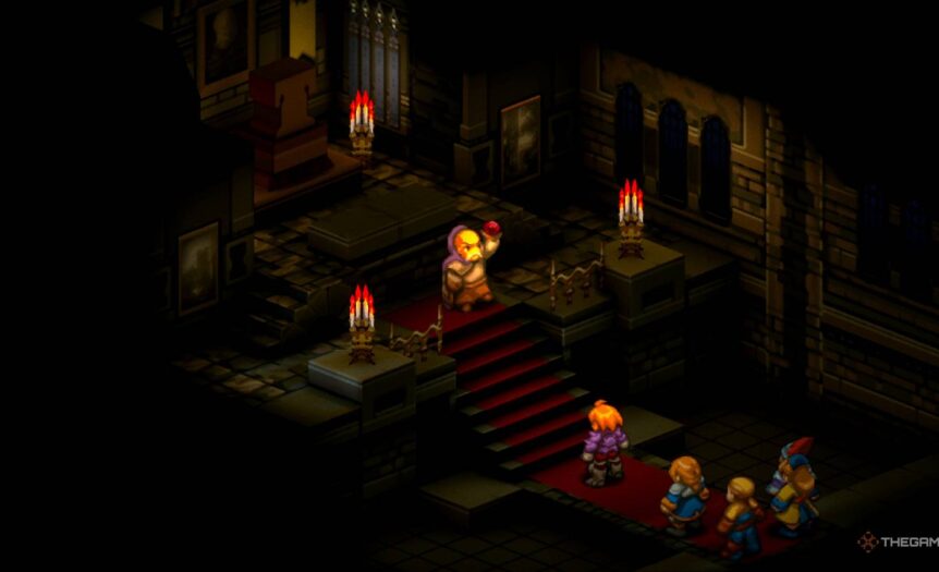 Если у вашего Рамзы есть Телепортация (Teleport), он может спрыгнуть со стены и присоединиться к основной группе, оставив Гаффгариона в одиночестве. Способность “Игнорировать высоту” (Ignore Elevation) тоже позволит быстрее добраться до рычага. Но обе эти способности требуют серьезного гринда, и, скорее всего, большинство игроков на этом этапе их еще не откроют.