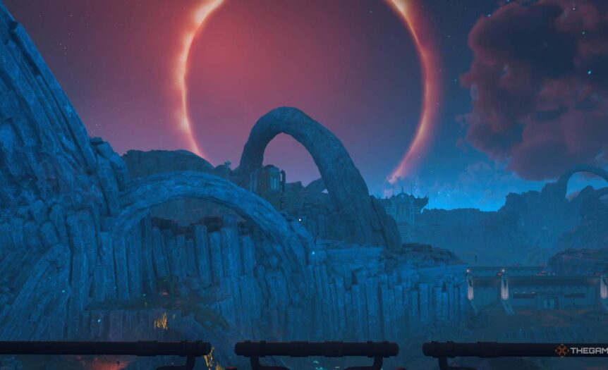 - С использованием Модулятора Разломов: Здесь есть два разлома. Сначала вы должны активировать разлом у двери башни, а затем внешний, что приведет к появлению ворот и нескольких контейнеров, позволяющих перелезть через забор и попасть на крышу башни, чтобы спрыгнуть внутрь.