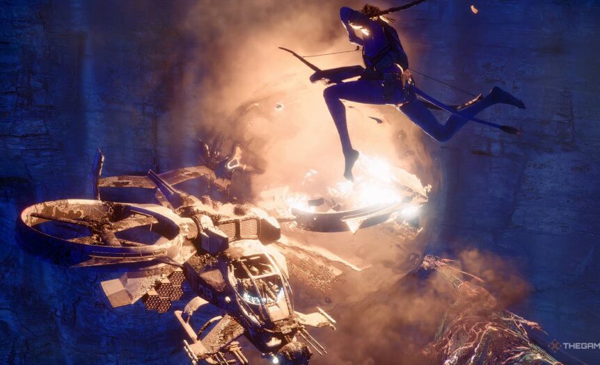 Не тратьте лишнее время на обычных солдат, лучше сосредоточьте весь огонь на Тараме. Использовать лук против него — затея сомнительная, так как цель слишком верткая. Лучше всего залить его свинцом из штурмовой винтовки, пока полоска здоровья не опустится до критической отметки, позволяющей провести добивание. Забрав трофей с поверженного врага, зачистите остатки RDA и возвращайтесь в пещеру к Улинаю и Кукулопе.