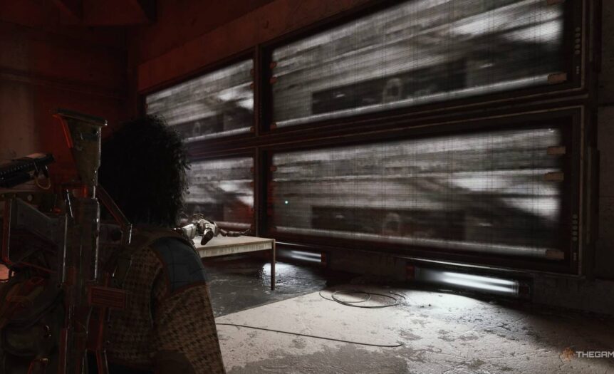 Внутри комнаты, помимо прочего лута, спуститесь по лестнице в правый угол. Там находится магнитофон — взаимодействуйте с ним, чтобы прослушать запись и обновить задание. Затем поверните налево к стене с мониторами и найдите контейнер для кинопленки, похожий на стиральную машину.